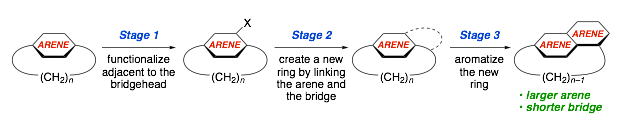 A new strategy for the synthesis of small, highly strained cyclophanes has been developed. It is a three-stage process, which commences with an existing small cyclophane. The first step is to functionalize the aromatic system at a position adjacent to one of the bridgeheads. This is followed by synthetic manipulation that leads to the formation of a new six-membered ring linking the arene to the benzylic position. Finally, the new ring is aromatized to afford a new cyclophane, which has both a larger aromatic system and a shorter bridge than the starting cyclophane. In essence, the bridge is being used as food for the growth of the aromatic system. The gain of ASE again plays a role in offsetting the increase in strain in the final step.