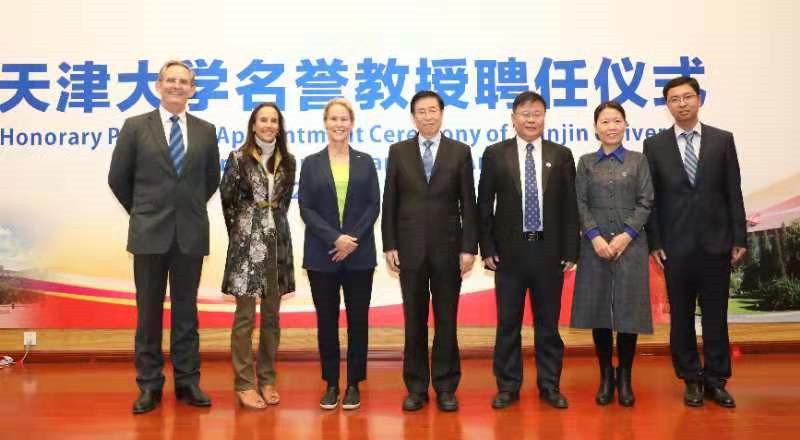 Li Jiajun, Party Secretary of Tianjin University, Yuan Yingjin, Vice President of Tianjin University, Prof. Jay Siegel, Dean of School of Pharmacy, Feng Cuiling, Party Secretary of the School of Pharmacy, Kim Baldridge, Associate Dean of the School of Pharmacy, Robert Borris, Peter Taylor, Du Yunfei, Zhang Ling, Zhou Yan Chen Le, deputy secretary of the Party Committee of the School of Pharmacy, and Zhao Jianhua, deputy director of the International Cooperation and Exchange Department, attended the ceremony.