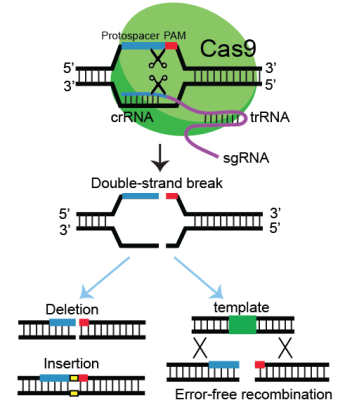 Double-strand breaks generated by Cas9 guided with RNA molecules. The breaks are repaired via error-prone (insertion or deletion) or error-free recombination. Yellow box represents small nucleotide insertion and green box represents insertion of GFP tag. This figure is modified from Current Protocols in Molecular Biology by Kim and Colaiacovo (2019).