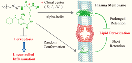 Fig 1. Radical trapping chiral polymers for prolonged membrane retention, and enhanced inhibition of ferroptosis and uncontrolled inflammation.