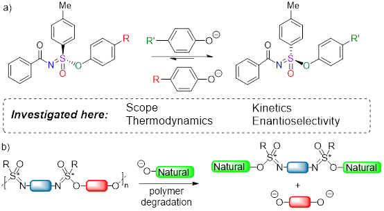 Figure 1. a) General scheme for sulfur(VI) phenolate exchange reaction, and facets under current study. b) Degradation of polysulfonimidates.