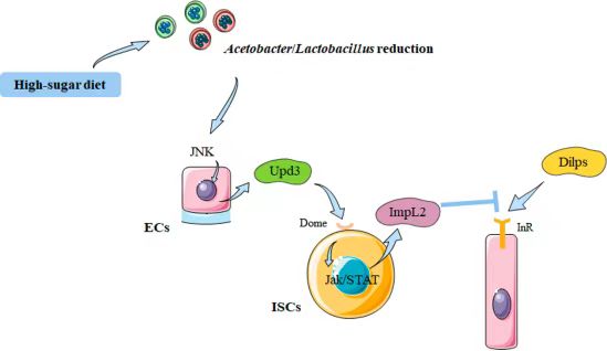 A high-sugar diet caused an increase in blood glucose levels in the fruit flies and significantly suppressed the activity of the insulin pathway. Supplementation with acetobacter and lactobacillus led to a significant decrease in the flies’ blood glucose levels. This phenomenon was attributed to the elevated JNK-JAK/STAT signaling pathway activity and release of the insulin receptor antagonist ImpL2 in the fruit fly’s intestine when acetobacter and lactobacillus were lacking. However, after probiotic supplementation, the activity of the JNK-JAK/STAT signaling pathway in the flies’ intestine was inhibited, reducing the release of ImpL2 and allowing the insulin pathway to be activated normally, thereby helping to lower blood glucose levels.