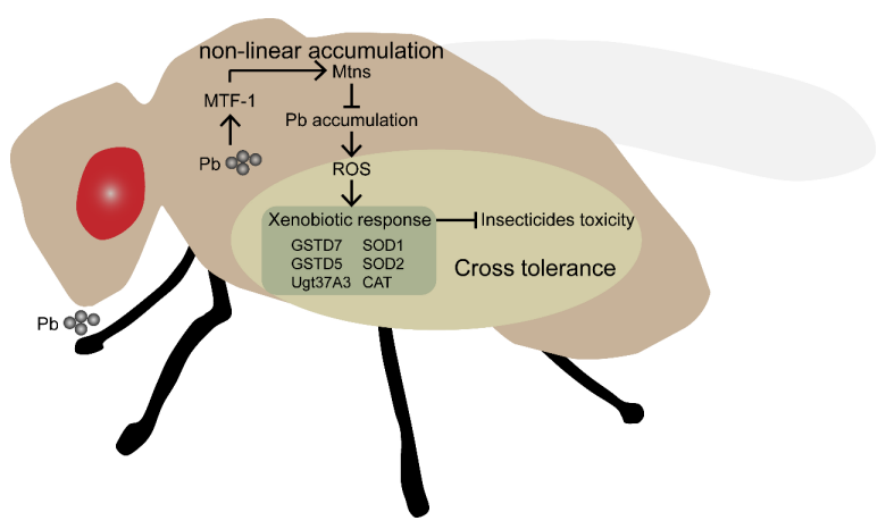 Furthermore, the interplay between metal metabolic pathways and exogenous response pathways resulted in a cross-tolerance of lead-exposed Drosophila melanogaster towards insecticides and other organic toxins.Lead poisoning-induced oxidative stress may serve as a bridge connecting detoxification responses to both inorganic and organic harmful substances within the organism.These findings shed light on a novel mechanism through which environmental heavy metal pollution affects agricultural ecosystems.