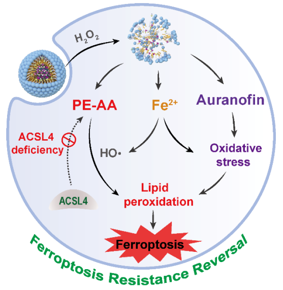 Cancer resistance is often associated with the presence of persister cells and the polarization of cancer cells towards a mesenchymal state. Therefore, ferroptotic cancer therapy has gained extensive attention because it is potent to eradicate resistant cancers that are refractory to conventional apoptosis-based approaches. Tailored phospholipids (arachidonoyl phosphatidylethanolamine/PE-AA) are the execution molecules of ferroptosis and their synthesis relies on the long-chain acyl-CoA synthetase 4 (ACSL4). However, the expession of ACSL4 in certain tumors is very low, resulting in ferroptosis resistance. To address this issue, the Zhao and Wang Group at SPST employed a ferrocene-bearing polymer micelles to co-deliver PE-AA and auranofin (Aur) to ACSL4-deficient breast cancer (MCF-7) in attempt to circumvent the ferroptosis resistance (Figure 1). Aur targets thioredoxin reductase and regulates redox homeostasis. The ferrocene in the micelles enabled the H2O2-responsive micelle disassembly and cargo release in the MCF-7 cells. Meanwhile, the Fenton-like reaction between ferrocene and H2O2 released the iron and produced reactive oxygen species; both could sensitize ferroptosis. The co-delivery of PE-AA and Aur potently induced ferroptosis in vitro and in vivo. In particular, PE-AA could circumvent the difficulty of ferroptotic lipid biosynthesis in ACSL4-deficient MCF-7 tumors. This work provides a facile approach to sensitize ferroptosis-resistant tumors to lipid peroxidation, which may expand the application of ferroptotic cancer therapy.
