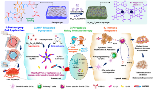 Prof. Nan Li's group designed and developed a magnetically responsive hydrogel GelTAMNPs with gelatin-tannic acid gel (GelTA) crosslinked with magnetic bimetallic particles (Zn0.35Fe0.65) by the method of "self-crosslinking" of the natural components. When solid tumors are surgically removed, the magnetic hyperthermia and metal ions generated by GelTAMNPs under an alternating magnetic field could activate cellular pyroptosis as well as release large amounts of inflammatory factors. Subsequently, the contents of the necrotic cells and the inflammation-causing components act like a "relay baton" to perpetuate the state of immune activation, which, in combination with PD-1 immune checkpoint blockade, significantly inhibits recurrence and metastasis. Thus, this hydrogel is a potential highly magnetically sensitive focal death-relay-immunotherapy platform for postoperative adjuvant therapy.