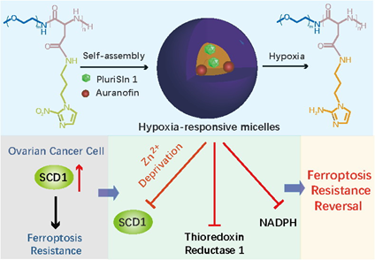 Ferroptosis has been recognized as a promising therapeutic strategy for cancer due to its unique mechanism of action. However, the upregulation of stearoyl-CoA desaturase 1 (SCD1) in ovarian cancer leads to resistance to ferroptotic therapy. Zinc ion (Zn2+) serves as the cofactor of SCD1. It was hypothesized that selective deprivation of Zn2+ from SCD1 could sensitize ferroptotic ovarian cancer therapy. Here, we report a hypoxia-responsive polymer micelle for enhanced ferroptosis of ovarian cancer cells. A SCD1 inhibitor, PluriSIn 1 (Plu), and a ferroptosis inducer, Auranofin (Aur), were co-encapsulated in nitroimidazole-bearing micelles. Under the hypoxic tumor microenvironment, the conversion of nitroimidazole to aminoimidazole triggered the cargo release and induced the depletion of antioxidant molecules (e.g., glutathione, thioredoxin, and NADPH). Meanwhile, because of the strong coordination between aminoimidazole and Zn2+ compared to that of histidine and Zn2+, such conversion can deprive the metal cofactor of SCD1, hence sensitizing the action of Plu and Aur. The proof-of-concept was demonstrated in cell and animal models with minimal systemic toxicity. The current work integrates ferroptosis induction with SCD1 inhibition in a hypoxia-responsive vehicle, offering a promising strategy for addressing the ferroptosis resistance and opening novel avenues for managing the difficult-to-treat ovarian cancer.