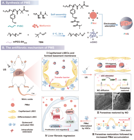 In this study, PMS enabled ultrasound-triggered and controllable release of nitric oxide from mSNO. This process upregulated intracellular cyclic guanosine monophosphate (cGMP), promoted reversal of LSEC capillarization, restored the fenestral structure of liver sinusoids, and enhanced endothelial permeability. Through this repair mechanism, PMet was able to penetrate the sinusoidal barrier and accumulate in fibrotic tissues, where it was subsequently taken up by HSCs. After release in lysosomes, metformin ultimately inhibited the proliferation and migration of HSCs via the AMPK-mTOR signaling pathway. These findings provide a new strategy for combination therapy in liver fibrosis.