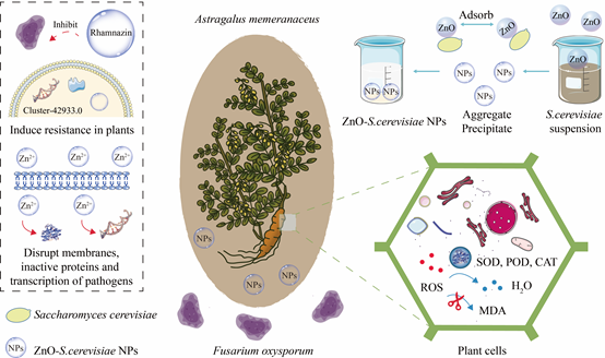 ZnO-S.cerevisiae not only is an antifungal agent to inhibit root rot, but also promotes growth and metabolism of A.memeranaceus. The mechanism showed that ZnO-S.cerevisiae inhibited the growth of F.oxysporum, stimulated antifungal components and resistance genes of A.memeranaceus. The multifunctional ZnO-S.cerevisiae with superior antifungal activity provides a promising alternative to the traditional antifungal agents and has great potential in plant protection.